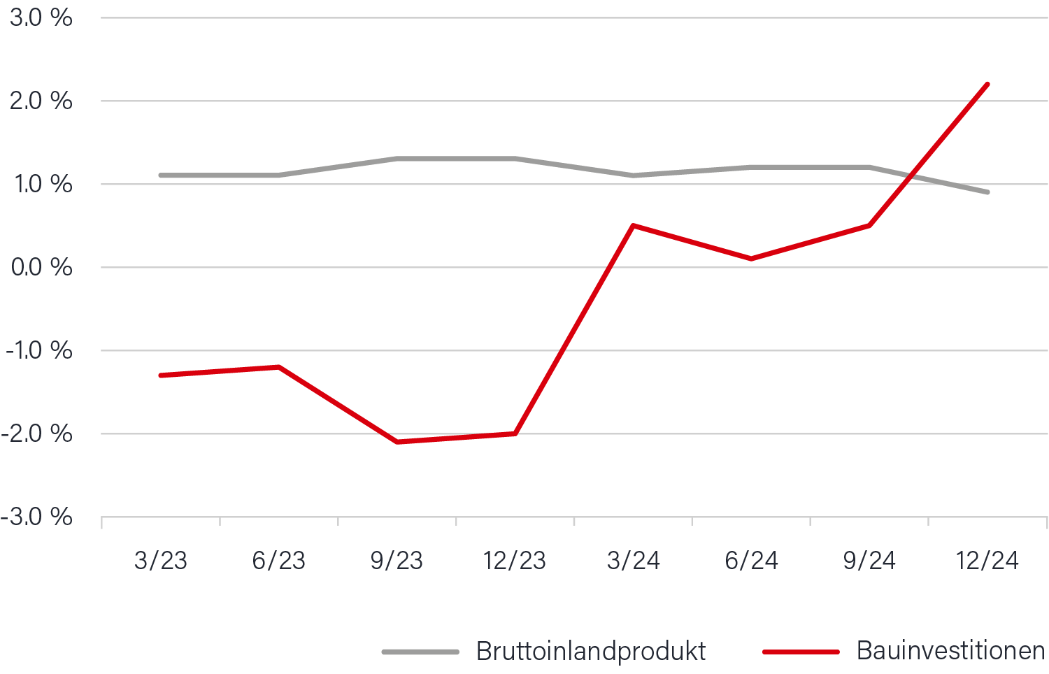 Die Wachstumserwartungen für das Bruttoinlandprodukt (BIP) bewegen sich seit dem ersten Quartal 2023 seitwärts. Damit haben sich die unterschiedlichen Komponenten der BIP-Prognosen (privater Konsum, Staatskonsum, Bauinvestitionen, Warenexporte usw.) gegenseitig ausgeglichen und gesamtwirtschaftliche Stabilität zur Folge gehabt. Die Wachstumsprognosen der Bauinvestitionen hingegen haben sich von negativen Erwartungen im Jahr 2023 zu positiven Erwartungen im Jahr 2024 entwickelt. Für das letzte Quartal 2024 prognostizierte die Expertengruppe Konjunkturprognosen des Bundes für die BIP-Komponente Bauinvestitionen mit 2.3 Prozent sogar ein stärkeres Wachstum als für die allgemeine Wirtschaft mit 0.9 Prozent. Der Bau wurde demgemäss zur Stütze der Wirtschaft.