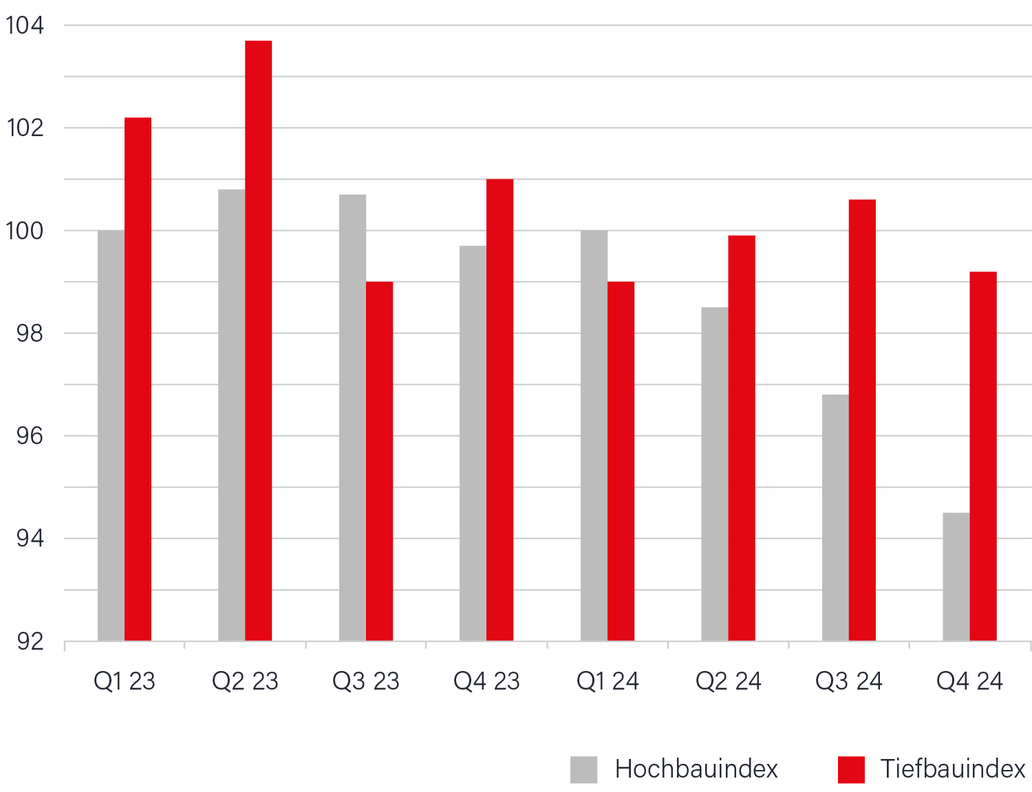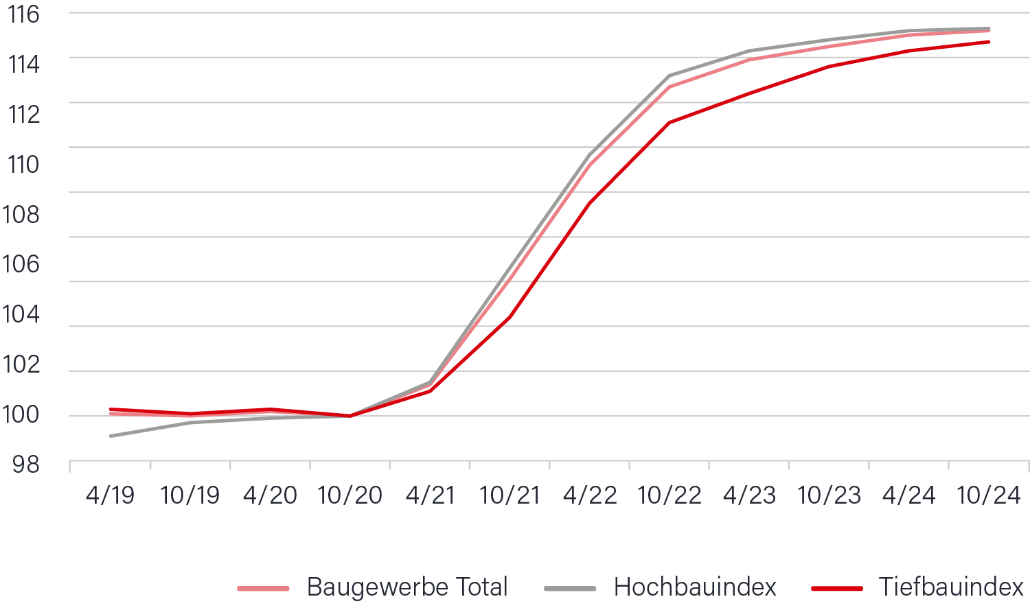 Der Baupreisindex des Bundesamtes für Statistik (BFS) erhöhte sich zwischen April und Oktober 2024 um 0,1 Prozent auf 115,2 Punkte. Innert Jahresfrist ist das Preisniveau im Baugewerbe um 0,5 Prozent gestiegen. Der Anstieg des Preisindexes im Hochbau ist gemäss BFS hauptsächlich auf höhere Preise bei den «Elektroanlagen» und den «Honoraren» sowie im «Rohbau 2» zurückzuführen. Im Tiefbau sind höhere Preise bei «Honoraren» sowie «Trassenbauten» zu beobachten. Im Mehrjahresvergleich stabilisieren sich die Preise im Bausektor und entwickeln sich neuerdings seitwärts.